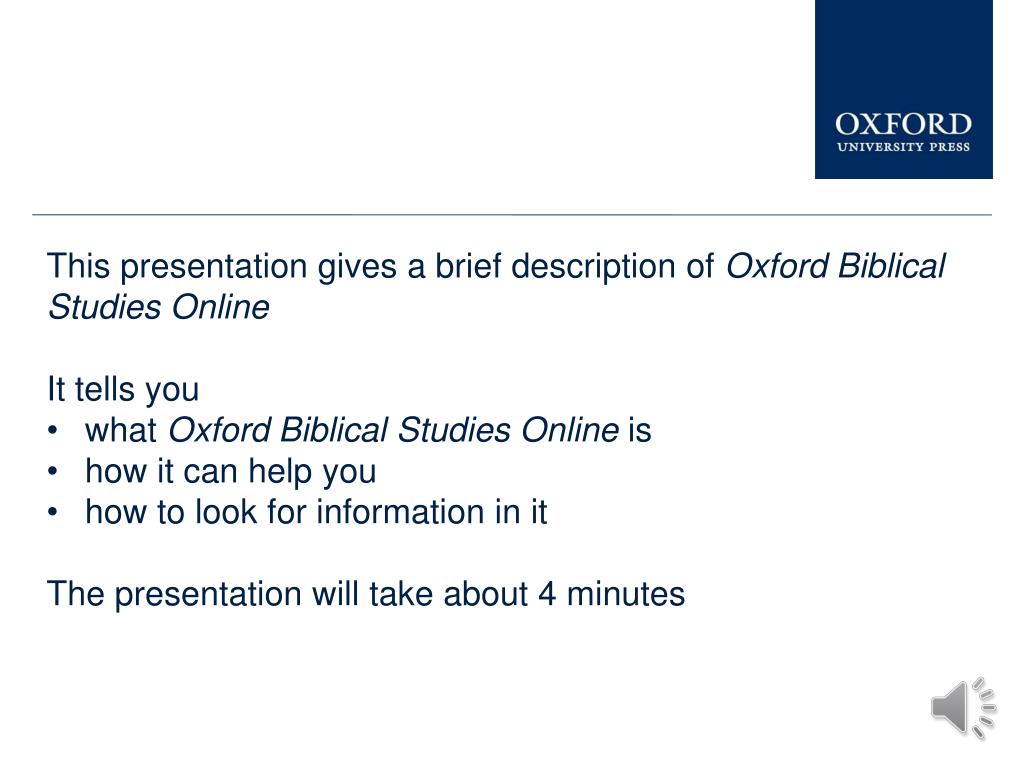 This presentation gives a brief description of Oxford Biblical Studies Online • It tells you • what Oxford Biblical Studies Online is • how it can help you • how to look for information in it • The presentation will take about 4 minutes