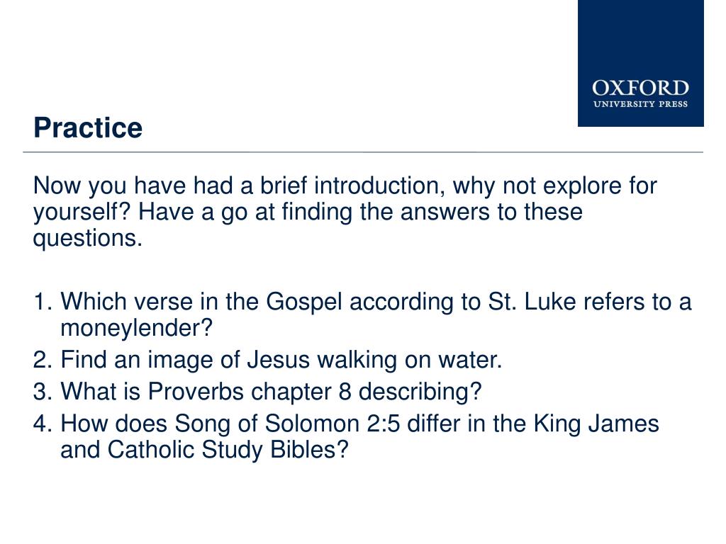 Practice • Now you have had a brief introduction, why not explore for yourself? Have a go at finding the answers to these questions. • Which verse in the Gospel according to St. Luke refers to a moneylender? • Find an image of Jesus walking on water. • What is Proverbs chapter 8 describing? • How does Song of Solomon 2:5 differ in the King James and Catholic Study Bibles?
