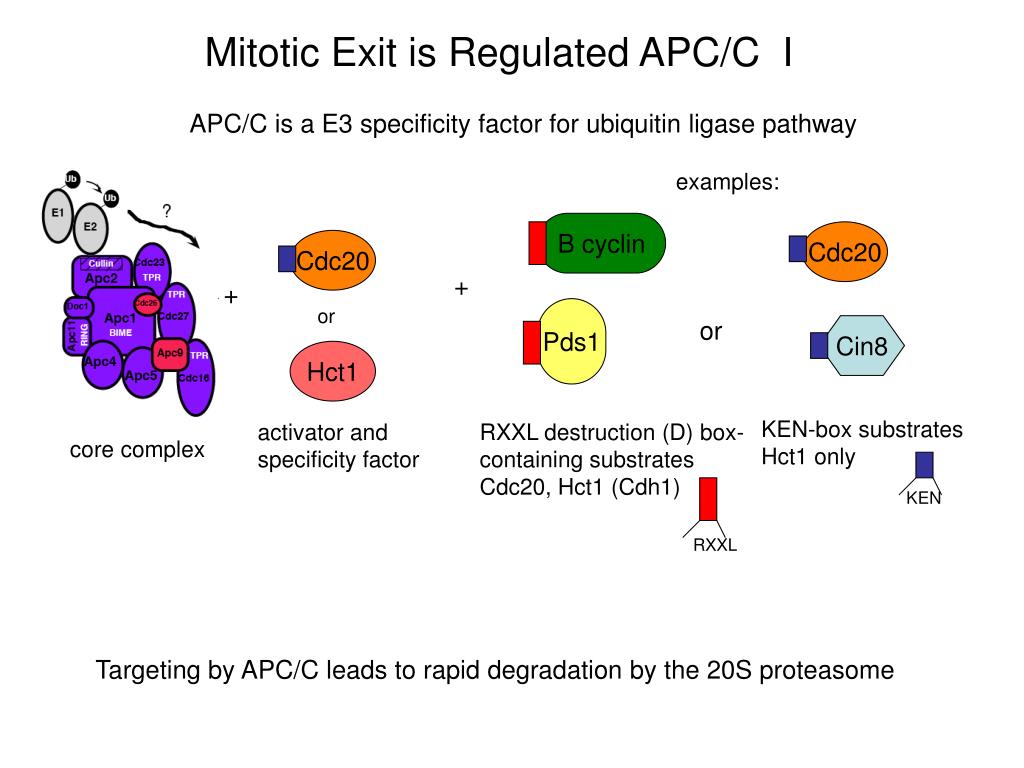 KEN RXXL Mitotic Exit is Regulated APC/C I APC/C is a E3 specificity factor for ubiquitin ligase pathway examples: B cyclin Cdc20 Cdc20 + + or Pds1 or Cin8 Hct1 KEN-box substrates Hct1 only activator and specificity factor RXXL destruction (D) box- containing substrates Cdc20, Hct1 (Cdh1) core complex Targeting by APC/C leads to rapid degradation by the 20S proteasome