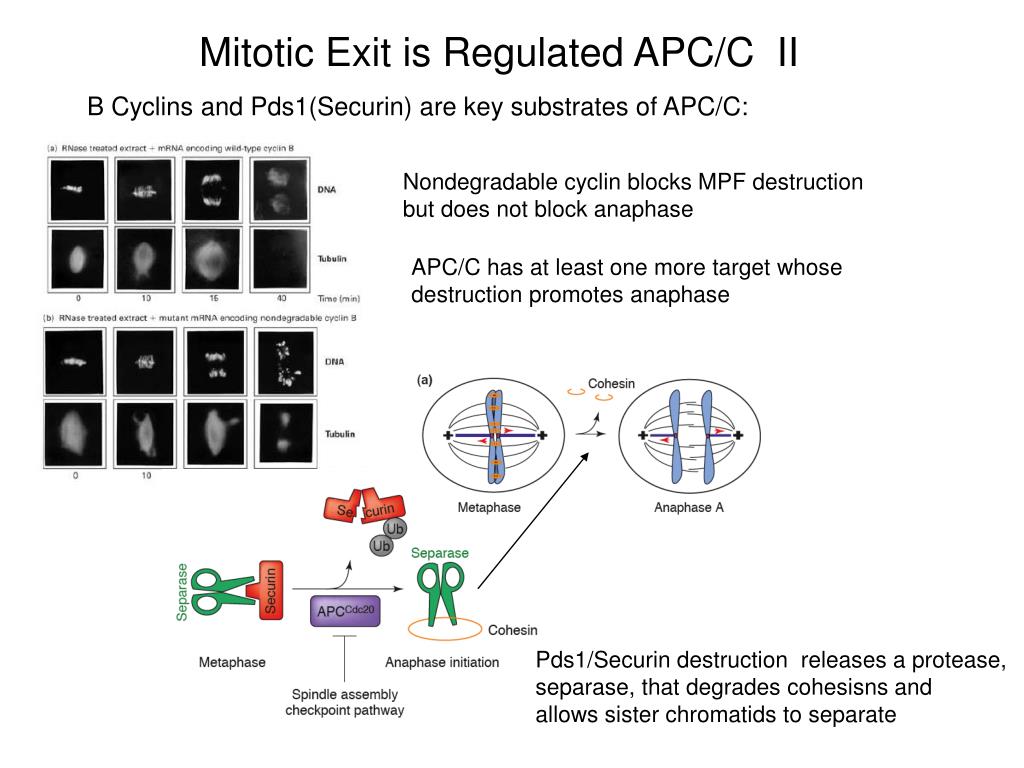 Mitotic Exit is Regulated APC/C II B Cyclins and Pds1(Securin) are key substrates of APC/C: Nondegradable cyclin blocks MPF destruction but does not block anaphase APC/C has at least one more target whose destruction promotes anaphase Pds1/Securin destruction releases a protease, separase, that degrades cohesisns and allows sister chromatids to separate