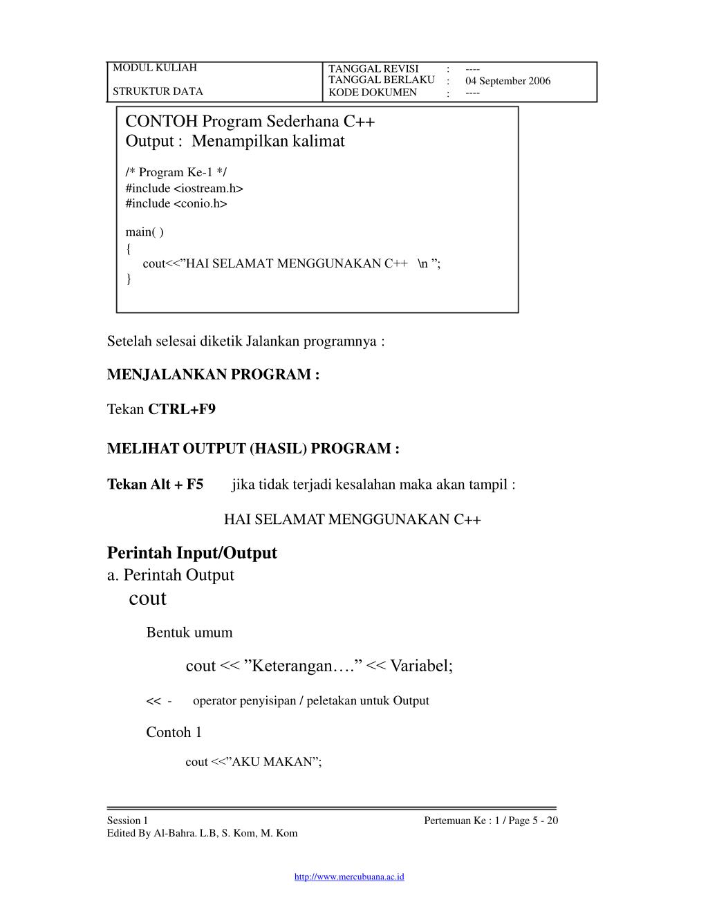 MODUL KULIAH STRUKTUR DATA TANGGAL REVISI TANGGAL BERLAKU KODE DOKUMEN : : : ---- 04 September 2006 ---- CONTOH Program Sederhana C++ Output : Menampilkan kalimat /* Program Ke-1 */ #include <iostream.h> #include <conio.h> main( ) { cout<<”HAI SELAMAT MENGGUNAKAN C++ \n ”; } Setelah selesai diketik Jalankan programnya : MENJALANKAN PROGRAM : Tekan CTRL+F9 MELIHAT OUTPUT (HASIL) PROGRAM : Tekan Alt + F5 jika tidak terjadi kesalahan maka akan tampil : HAI SELAMAT MENGGUNAKAN C++ Perintah Input/Output a. Perintah Output cout Bentuk umum cout << ”Keterangan….” << Variabel; << - operator penyisipan / peletakan untuk Output Contoh 1 cout <<”AKU MAKAN”; Session 1 Edited By Al-Bahra. L.B, S. Kom, M. Kom http://www.mercubuana.ac.id Pertemuan Ke : 1 / Page 5 - 20