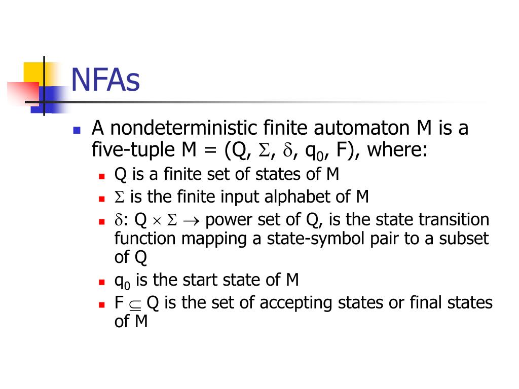 NFAs • A nondeterministic finite automaton M is a five-tuple M = (Q, , , q0, F), where: • Q is a finite set of states of M • is the finite input alphabet of M • : Q power set of Q, is the state transition function mapping a state-symbol pair to a subset of Q • q0 is the start state of M • F Q is the set of accepting states or final states of M