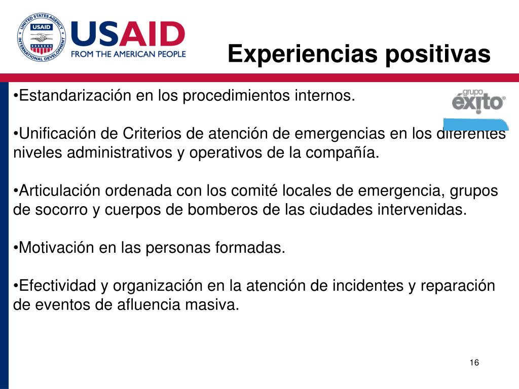 Experiencias positivas • Estandarización en los procedimientos internos. • Unificación de Criterios de atención de emergencias en los diferentes niveles administrativos y operativos de la compañía. • Articulación ordenada con los comité locales de emergencia, grupos de socorro y cuerpos de bomberos de las ciudades intervenidas. • Motivación en las personas formadas. • Efectividad y organización en la atención de incidentes y reparación de eventos de afluencia masiva.