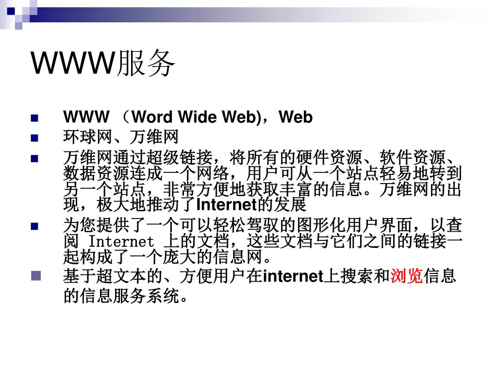 WWW服务 • WWW (Word Wide Web),Web • 环球网、万维网 • 万维网通过超级链接,将所有的硬件资源、软件资源、数据资源连成一个网络,用户可从一个站点轻易地转到另一个站点,非常方便地获取丰富的信息。万维网的出现,极大地推动了Internet的发展 • 为您提供了一个可以轻松驾驭的图形化用户界面,以查阅 Internet 上的文档,这些文档与它们之间的链接一起构成了一个庞大的信息网。 • 基于超文本的、方便用户在internet上搜索和浏览信息的信息服务系统。
