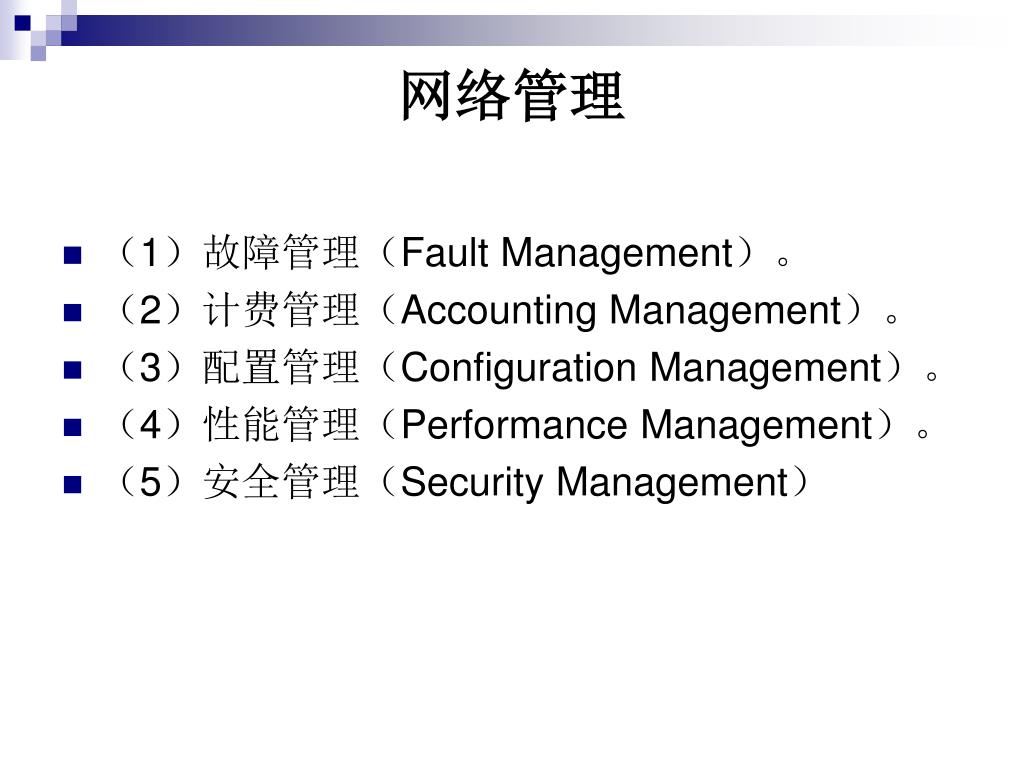 网络管理 • (1)故障管理(Fault Management)。 • (2)计费管理(Accounting Management)。 • (3)配置管理(Configuration Management)。 • (4)性能管理(Performance Management)。 • (5)安全管理(Security Management)