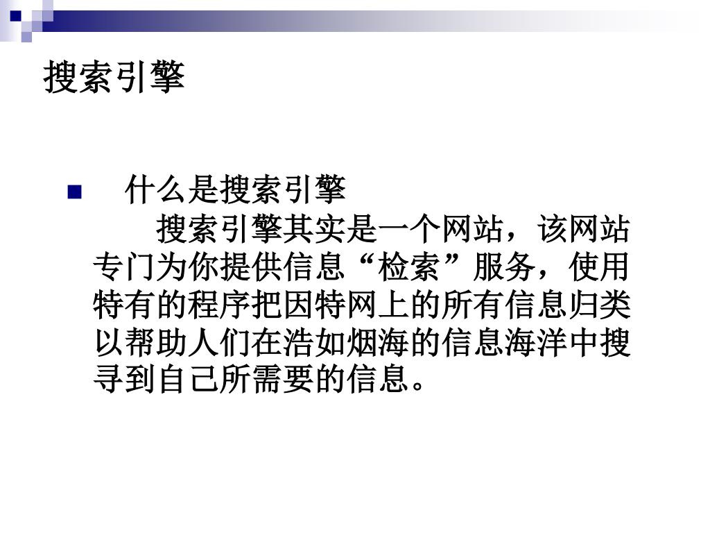 搜索引擎 • 什么是搜索引擎 搜索引擎其实是一个网站,该网站专门为你提供信息“检索”服务,使用特有的程序把因特网上的所有信息归类以帮助人们在浩如烟海的信息海洋中搜寻到自己所需要的信息。