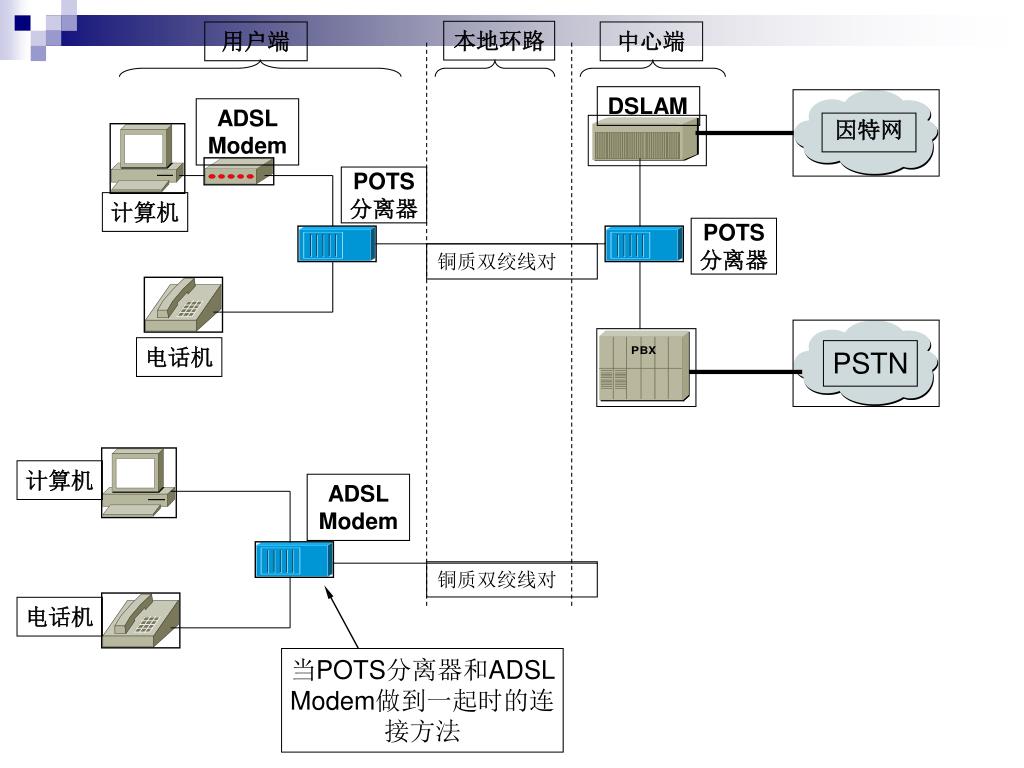 本地环路 用户端 中心端 DSLAM ADSL Modem 因特网 POTS 分离器 计算机 POTS 分离器 铜质双绞线对 电话机 PSTN 计算机 ADSL Modem 铜质双绞线对 电话机 当POTS分离器和ADSL Modem做到一起时的连接方法