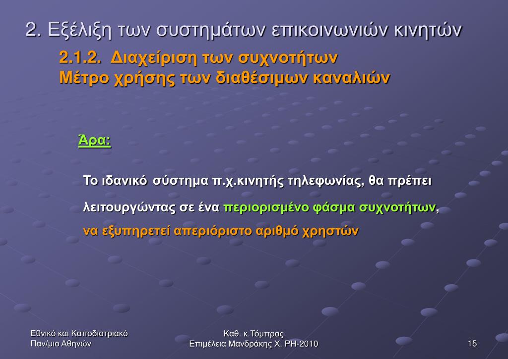 2. Εξέλιξη των συστημάτων επικοινωνιών κινητών αριθμός χρηστών Μο= πλήθος καναλιών (συμβατικά συστήματα) Τί είναι το Μο; 2.1.2. Διαχείριση των συχνοτήτων Μέτρο χρήσης των διαθέσιμων καναλιών Είναι ένα μέτρο της φασματικής απόδοσης (spectral efficiency)ενός συστήματος και σχετίζεται άμεσα με τη χωρητικότητα ή ραδιοχωρητικότητά του (radio-capacity) Καθ. κ.Τόμπρας Επιμέλεια Μανδράκης Χ. ΡΗ-2010