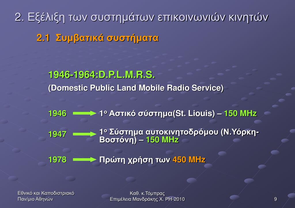 2. Εξέλιξη των συστημάτων επικοινωνιών κινητών 1946-1964:D.P.L.M.R.S. (Domestic Public Land Mobile Radio Service) 1946 1ο Αστικό σύστημα(St. Liouis) – 150 MHz 2.1 Συμβατικά συστήματα 1ο Σύστημα αυτοκινητοδρόμου (Ν.Υόρκη-Βοστόνη) – 150 MHz 1947 1978 Πρώτη χρήση των 450 MHz Καθ. κ.Τόμπρας Επιμέλεια Μανδράκης Χ. ΡΗ-2010