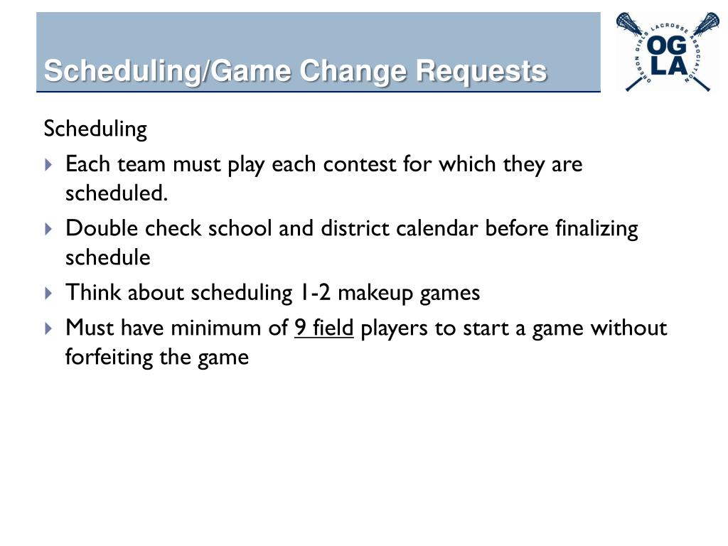 Scheduling/Game Change Requests Scheduling • Each team must play each contest for which they are scheduled. • Double check school and district calendar before finalizing schedule • Think about scheduling 1-2 makeup games • Must have minimum of 9 field players to start a game without forfeiting the game