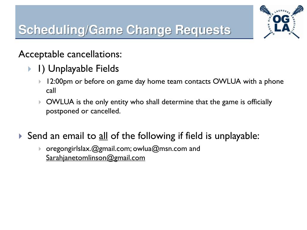 Scheduling/Game Change Requests Acceptable cancellations: • 1) Unplayable Fields • 12:00pm or before on game day home team contacts OWLUA with a phone call • OWLUA is the only entity who shall determine that the game is officially postponed or cancelled. • Send an email to all of the following if field is unplayable: • oregongirlslax.@gmail.com; owlua@msn.com and Sarahjanetomlinson@gmail.com