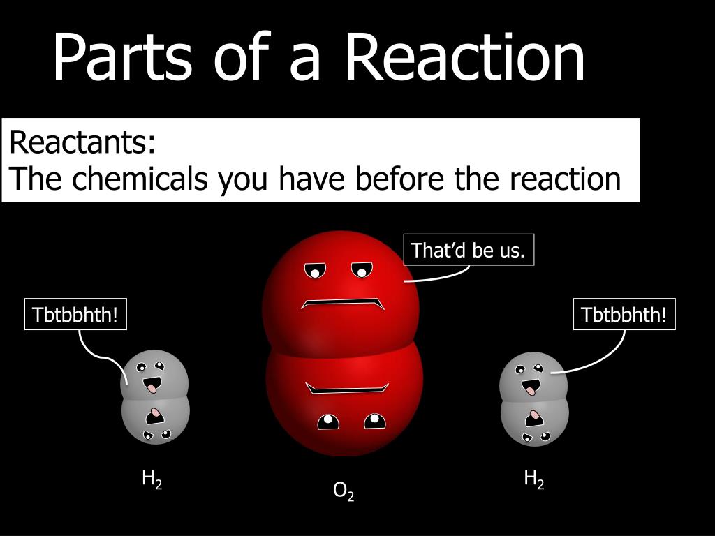 Parts of a Reaction Reactants: The chemicals you have before the reaction That’d be us. Tbtbbhth! Tbtbbhth! H2 H2 O2