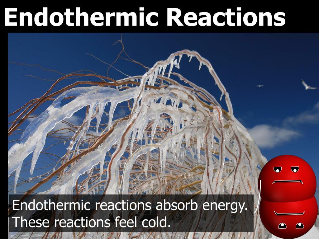 Endothermic Reactions Endothermic reactions absorb energy. These reactions feel cold.