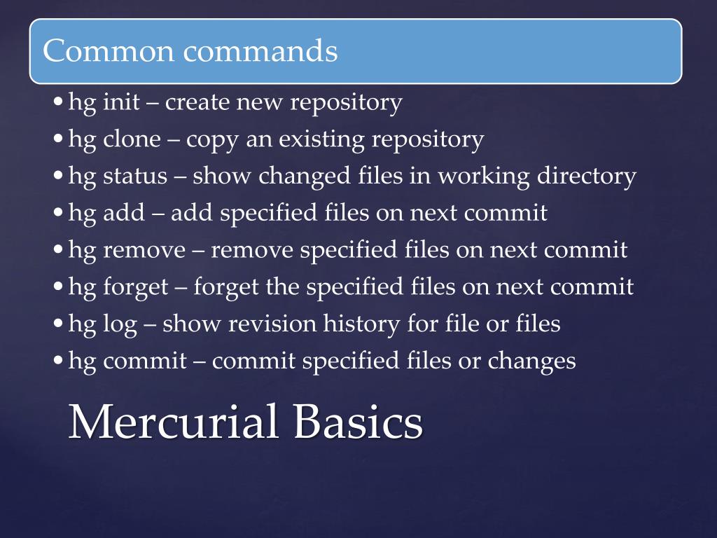 Disambiguation • hg com == hg commit • Commit is on entire directory • Not ideal for partial checkout scenarios • Empty directories are not tracked • Add EMPTY file Mercurial Concepts