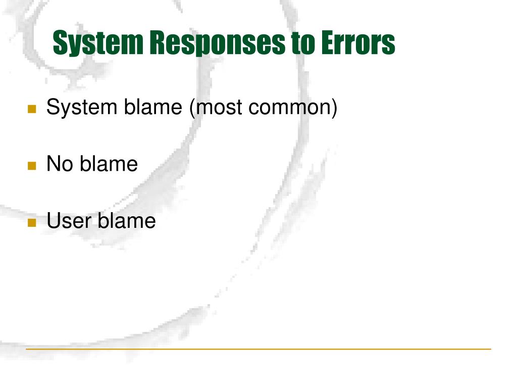 System Responses to Errors • System blame (most common) • No blame • User blame