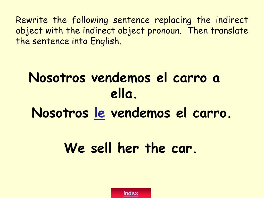 Rewrite the following sentence replacing the indirect object with the indirect object pronoun. Then translate the sentence into English. Nosotros vendemos el carro a ella. Nosotros le vendemos el carro. We sell her the car. index