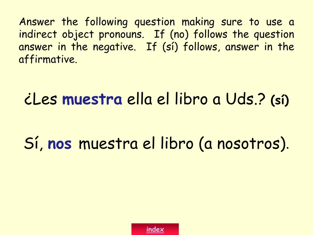 Answer the following question making sure to use a indirect object pronouns. If (no) follows the question answer in the negative. If (sí) follows, answer in the affirmative. ¿Les muestra ella el libro a Uds.? (sí) Sí, nosmuestra el libro (a nosotros). index
