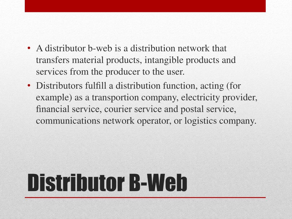 A distributor b-web is a distribution network that transfers material products, intangible products and services from the producer to the user. • Distributors fulfill a distribution function, acting (for example) as a transportion company, electricity provider, financial service, courier service and postal service, communications network operator, or logistics company. Distributor B-Web