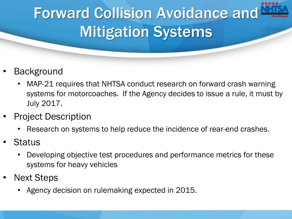 Forward Collision Avoidance and Mitigation Systems • Background • MAP-21 requires that NHTSA conduct research on forward crash warning systems for motorcoaches. If the Agency decides to issue a rule, it must by July 2017. • Project Description • Research on systems to help reduce the incidence of rear-end crashes. • Status • Developing objective test procedures and performance metrics for these systems for heavy vehicles • Next Steps • Agency decision on rulemaking expected in 2015.