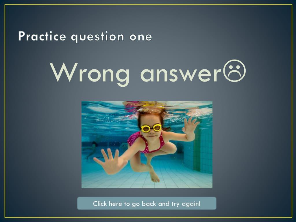 Practice question eight • What is one way to get started in competitive swimming? a. Go swimming in your pool at home. b. Go running. c. Join a swimming club/team. Main Menu