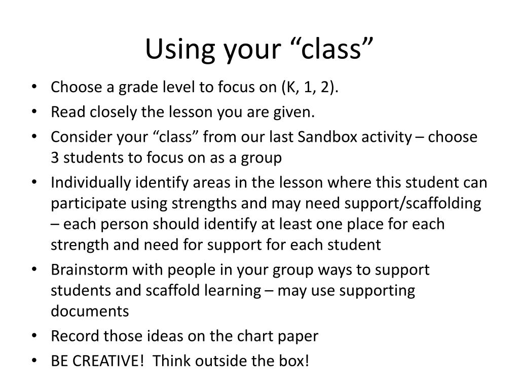 Using your “class” • Choose a grade level to focus on (K, 1, 2). • Read closely the lesson you are given. • Consider your “class” from our last Sandbox activity – choose 3 students to focus on as a group • Individually identify areas in the lesson where this student can participate using strengths and may need support/scaffolding – each person should identify at least one place for each strength and need for support for each student • Brainstorm with people in your group ways to support students and scaffold learning – may use supporting documents • Record those ideas on the chart paper • BE CREATIVE! Think outside the box!