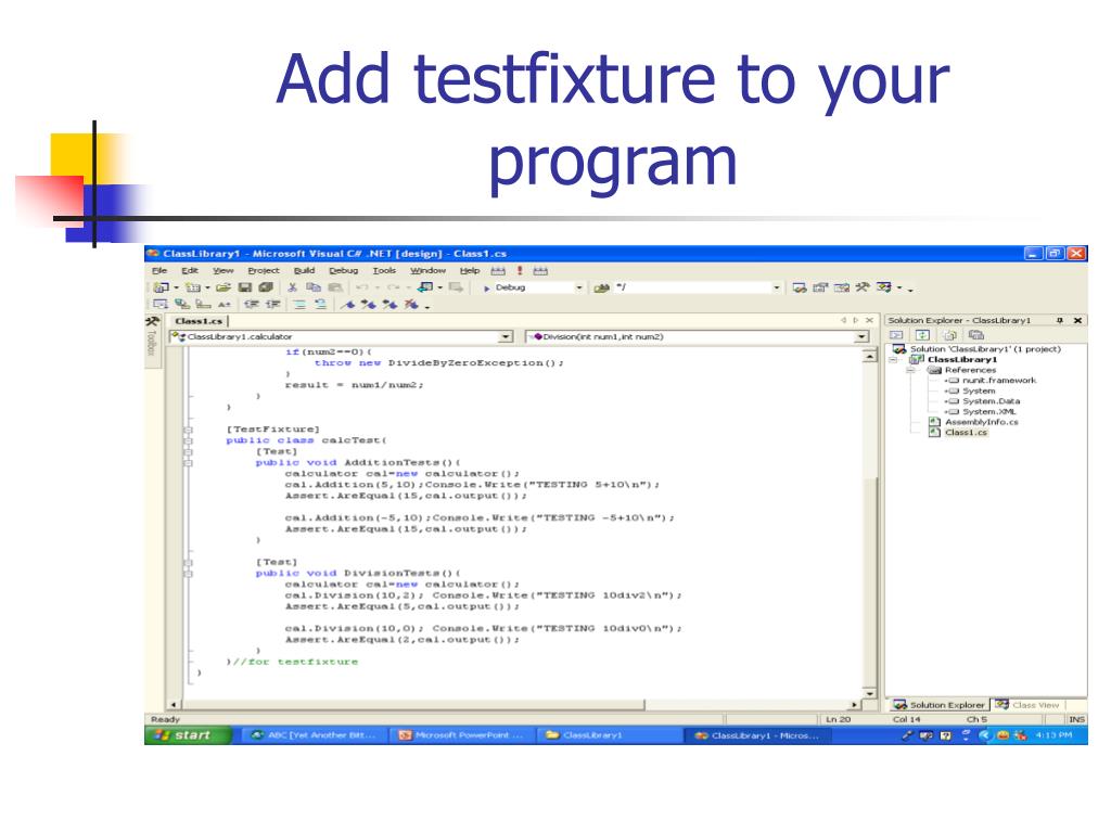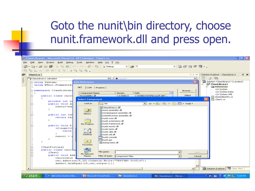 Things to do before testing cont…. • Add nunit.frameworks.dll to your project references. This dll resides in nunit\bin folder. • The next few screen shots show how to add this dll file if your project has been opened as a classlibrary.