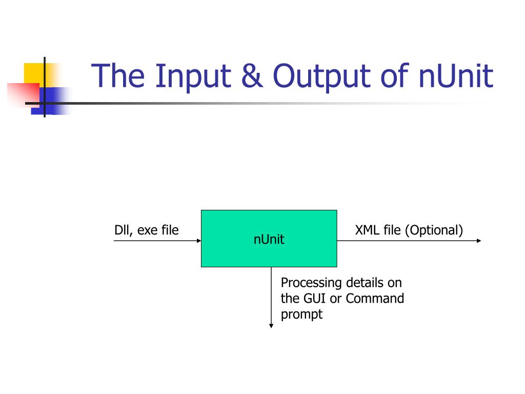 The Input & Output of nUnit nUnit Dll, exe file XML file (Optional) Processing details on the GUI or Command prompt