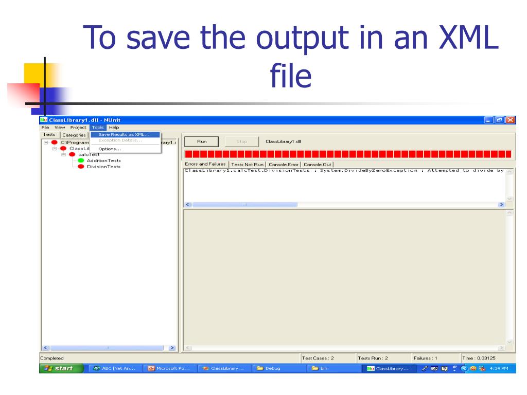 Console mode • The command to execute the exe in console mode is nunit-console.exe [filename] [option] Example: nunit-console.exe classlibrary1.dll -XML=ourfile.xml
