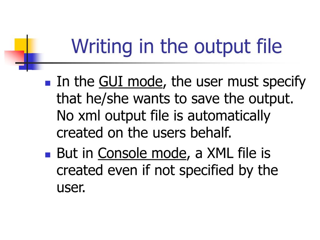 Writing in the output file • In the GUI mode, the user must specify that he/she wants to save the output. No xml output file is automatically created on the users behalf. • But in Console mode, a XML file is created even if not specified by the user.