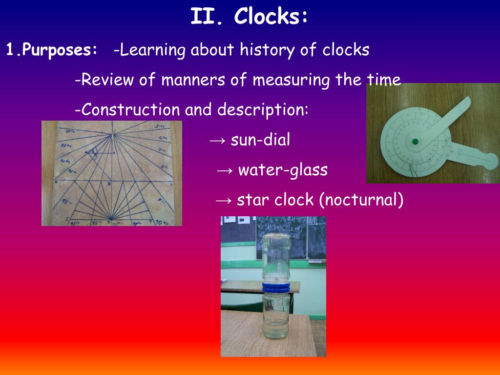 II. Clocks: 1.Purposes: -Learning about history of clocks -Review of manners of measuring the time -Construction and description: → sun-dial → water-glass → star clock (nocturnal)