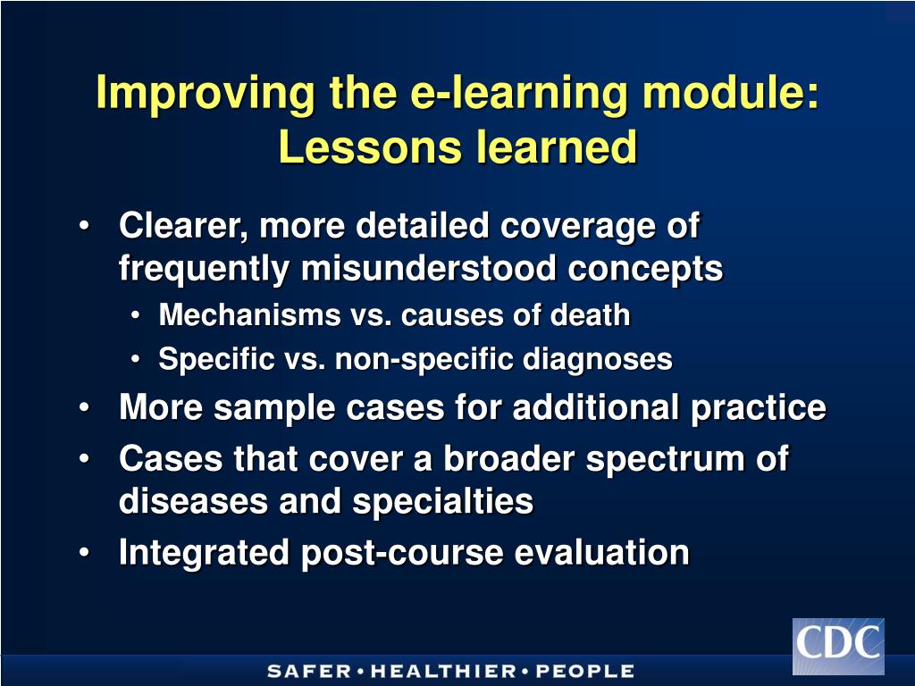 Improving the e-learning module: Lessons learned • Clearer, more detailed coverage of frequently misunderstood concepts • Mechanisms vs. causes of death • Specific vs. non-specific diagnoses • More sample cases for additional practice • Cases that cover a broader spectrum of diseases and specialties • Integrated post-course evaluation