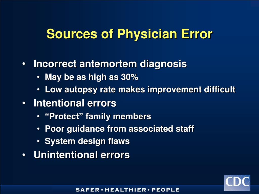 Sources of Physician Error • Incorrect antemortem diagnosis • May be as high as 30% • Low autopsy rate makes improvement difficult • Intentional errors • “Protect” family members • Poor guidance from associated staff • System design flaws • Unintentional errors