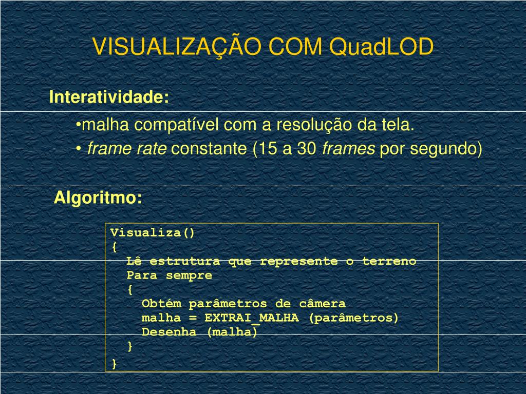 VISUALIZAÇÃO COM QuadLOD • Interatividade: • malha compatível com a resolução da tela. • frame rate constante (15 a 30 frames por segundo) Algoritmo: Visualiza(){ Lê estrutura que represente o terreno Para sempre { Obtém parâmetros de câmera malha = EXTRAI_MALHA (parâmetros) Desenha (malha) }}