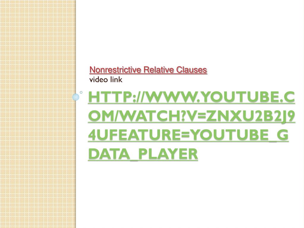 Nonrestrictive Relative Clauses video link http://www.youtube.com/watch?v=ZnXU2B2j94Ufeature=youtube_gdata_player
