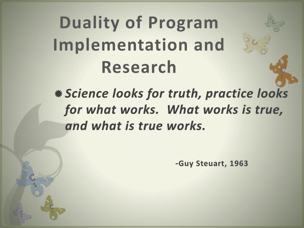 Duality of Program Implementation and Research • Science looks for truth, practice looks for what works. What works is true, and what is true works. -Guy Steuart, 1963