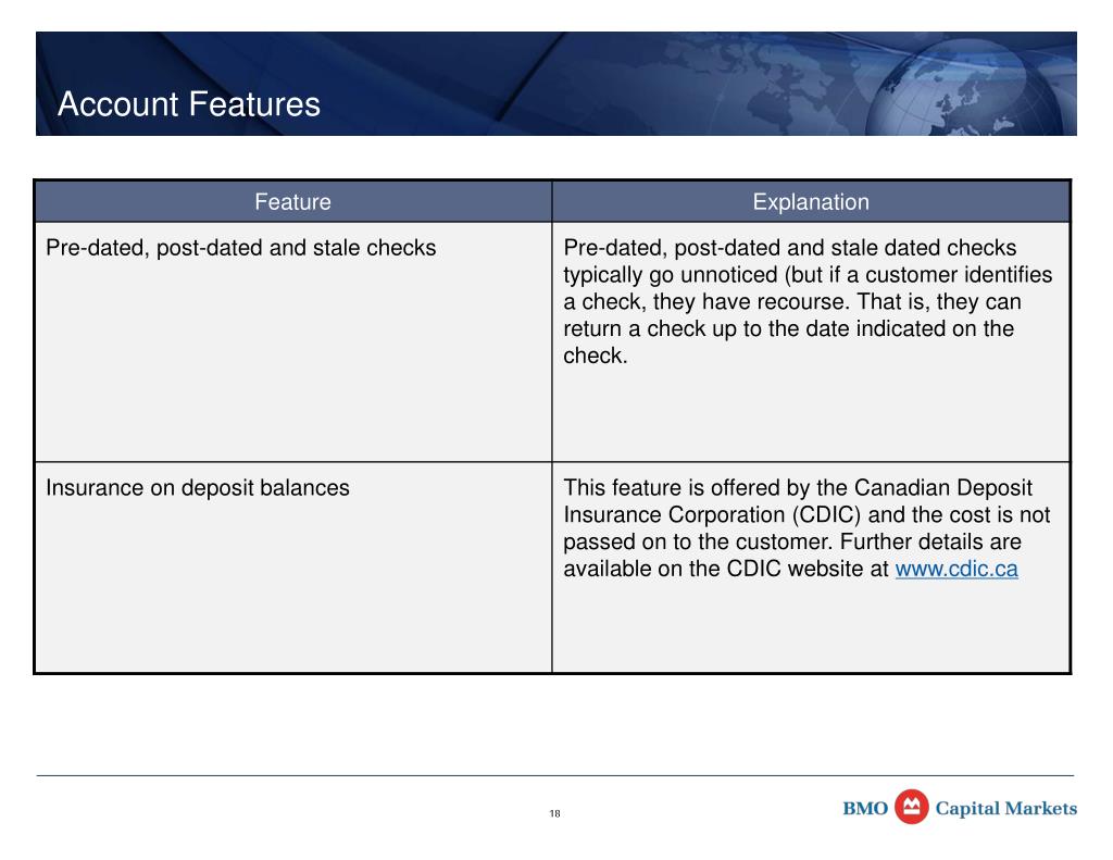 Current Account Characteristics • Available on BMO’s International platform (CBDS Accounts) or Domestic platform (Mech accounts) • Provides access to Canadian banking services • Both available in Canadian and US Dollars (domestic) • Credit and Terms and Conditions • On default, no overdraft limits will be made available on the checking accounts, i.e. operations take place on a “pre-funded” basis • Accounts will be interest bearing, however interest paying arrangements should be typically offered to customers on a defensive basis