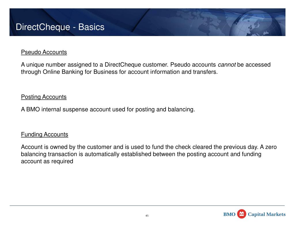 DirectCheque - Basics Pseudo Accounts A unique number assigned to a DirectCheque customer. Pseudo accounts cannot be accessed through Online Banking for Business for account information and transfers. Posting Accounts A BMO internal suspense account used for posting and balancing. Funding Accounts Account is owned by the customer and is used to fund the check cleared the previous day. A zero balancing transaction is automatically established between the posting account and funding account as required