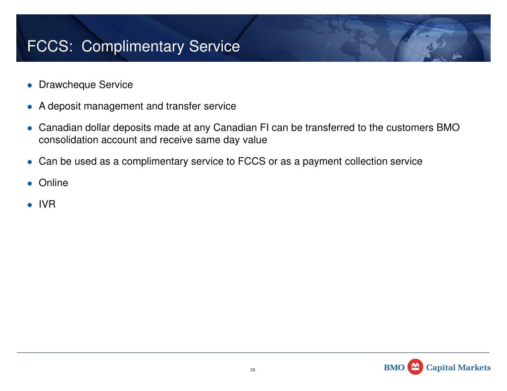 FCCS: Complimentary Service • Drawcheque Service • A deposit management and transfer service • Canadian dollar deposits made at any Canadian FI can be transferred to the customers BMO consolidation account and receive same day value • Can be used as a complimentary service to FCCS or as a payment collection service • Online • IVR