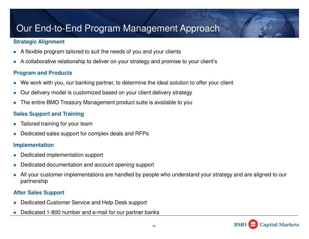 Our End-to-End Program Management Approach Strategic Alignment • A flexible program tailored to suit the needs of you and your clients • A collaborative relationship to deliver on your strategy and promise to your client’s Program and Products • We work with you, our banking partner, to determine the ideal solution to offer your client • Our delivery model is customized based on your client delivery strategy • The entire BMO Treasury Management product suite is available to you Sales Support and Training • Tailored training for your team • Dedicated sales support for complex deals and RFPs Implementation • Dedicated implementation support • Dedicated documentation and account opening support • All your customer implementations are handled by people who understand your strategy and are aligned to our partnership After Sales Support • Dedicated Customer Service and Help Desk support • Dedicated 1-800 number and e-mail for our partner banks