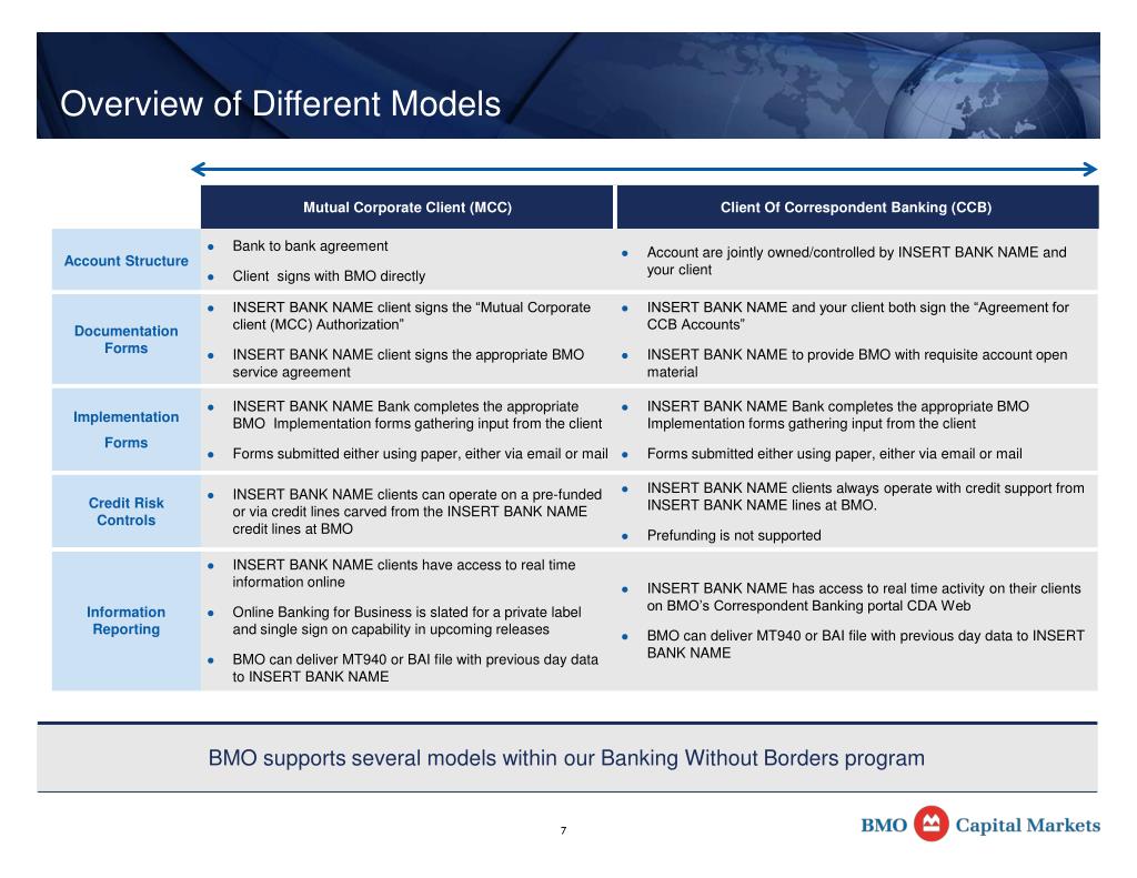 Overview of Different Models BMO supports several models within our Banking Without Borders program 7