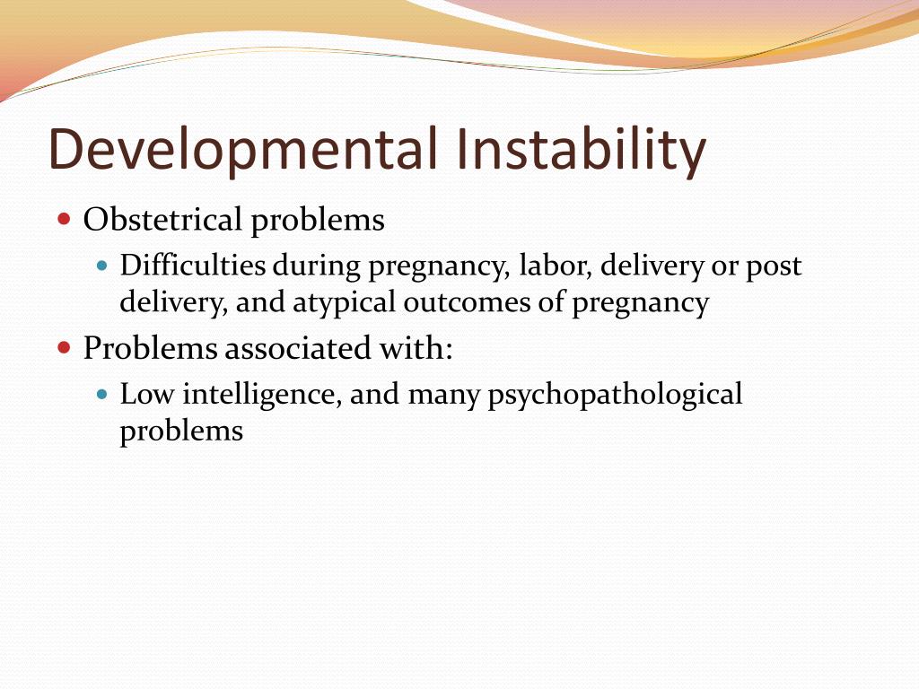 Developmental Instability • Obstetrical problems • Difficulties during pregnancy, labor, delivery or post delivery, and atypical outcomes of pregnancy • Problems associated with: • Low intelligence, and many psychopathological problems
