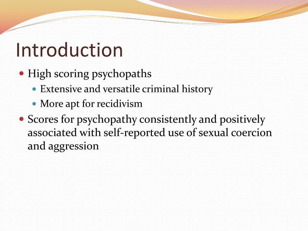 Introduction • High scoring psychopaths • Extensive and versatile criminal history • More apt for recidivism • Scores for psychopathy consistently and positively associated with self-reported use of sexual coercion and aggression