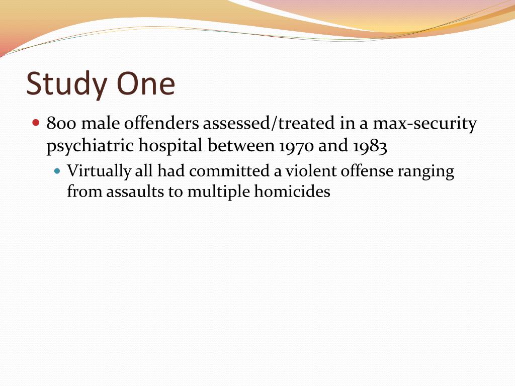 Study One • 800 male offenders assessed/treated in a max-security psychiatric hospital between 1970 and 1983 • Virtually all had committed a violent offense ranging from assaults to multiple homicides