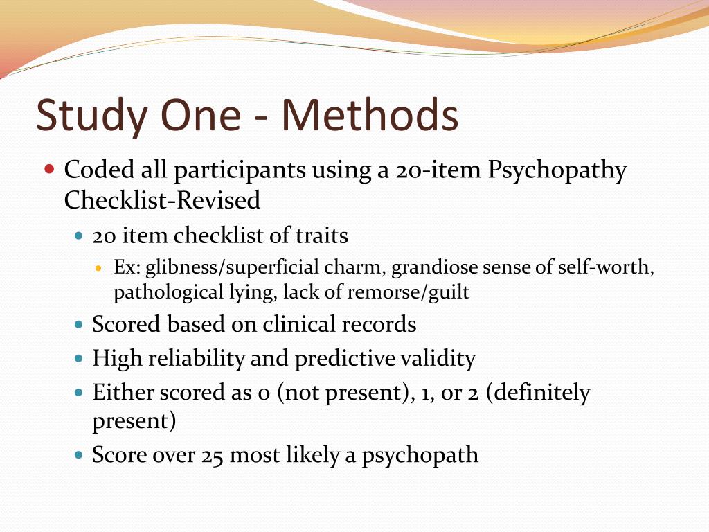 Study One - Methods • Coded all participants using a 20-item Psychopathy Checklist-Revised • 20 item checklist of traits • Ex: glibness/superficial charm, grandiose sense of self-worth, pathological lying, lack of remorse/guilt • Scored based on clinical records • High reliability and predictive validity • Either scored as 0 (not present), 1, or 2 (definitely present) • Score over 25 most likely a psychopath
