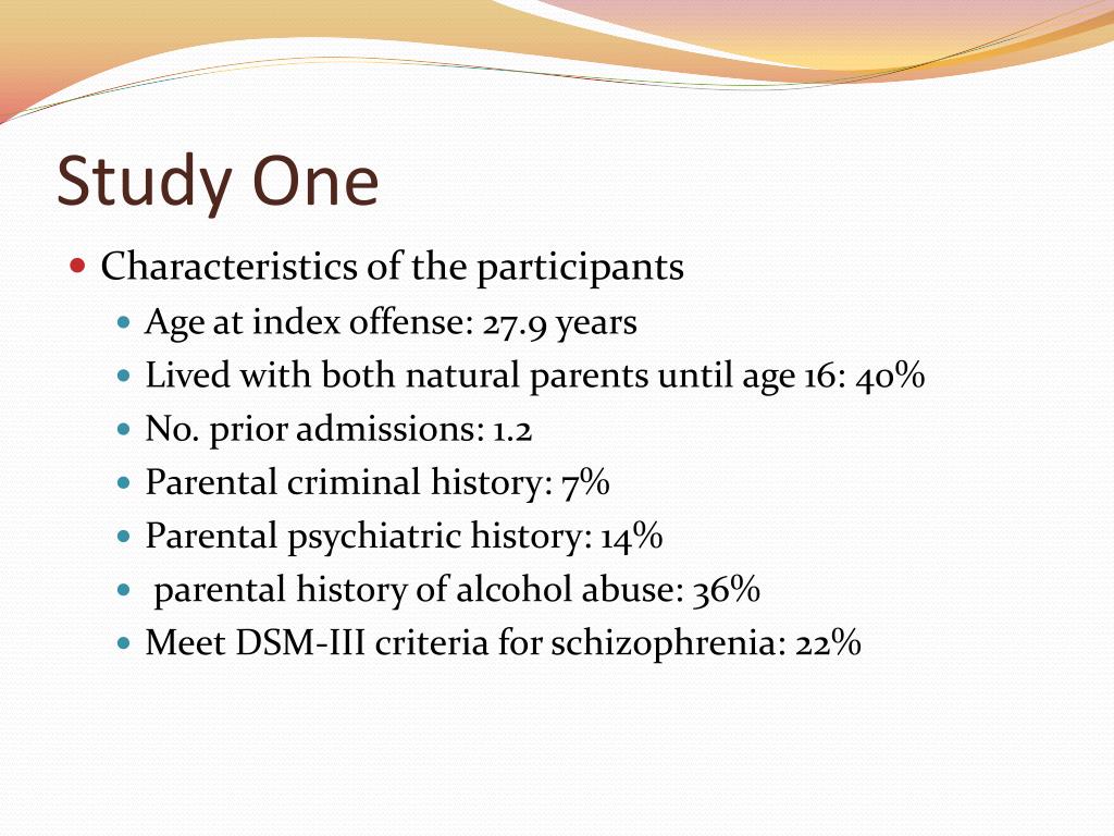 Study One • Characteristics of the participants • Age at index offense: 27.9 years • Lived with both natural parents until age 16: 40% • No. prior admissions: 1.2 • Parental criminal history: 7% • Parental psychiatric history: 14% • parental history of alcohol abuse: 36% • Meet DSM-III criteria for schizophrenia: 22%