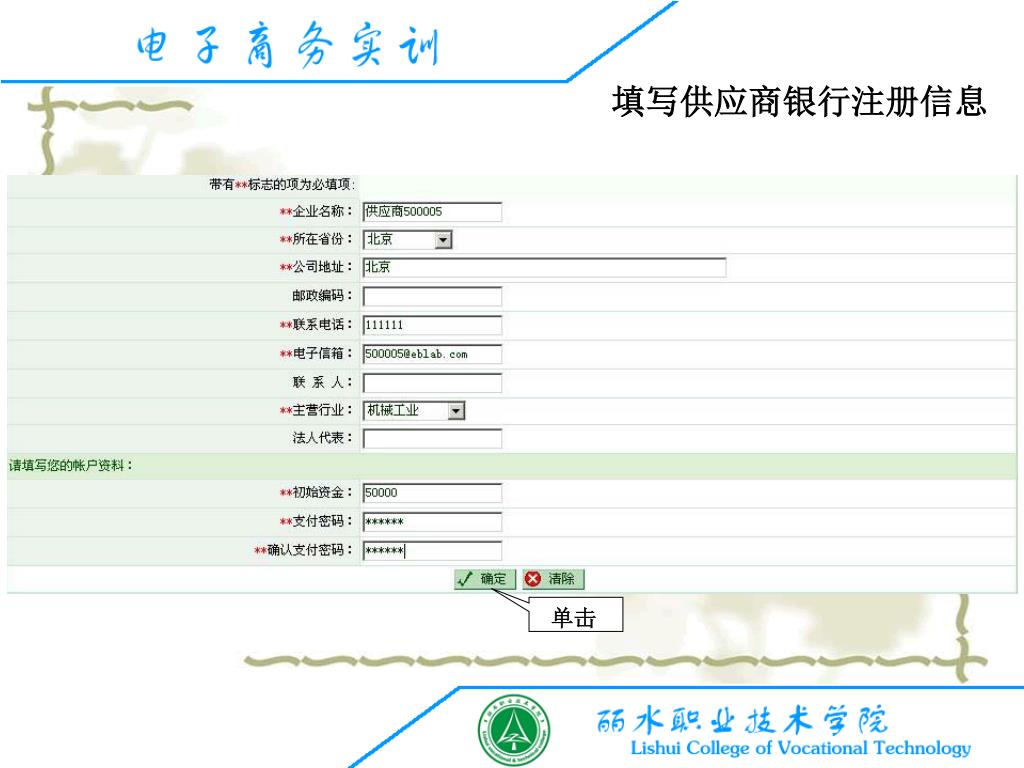 填写供应商银行注册信息 单击