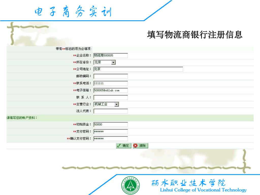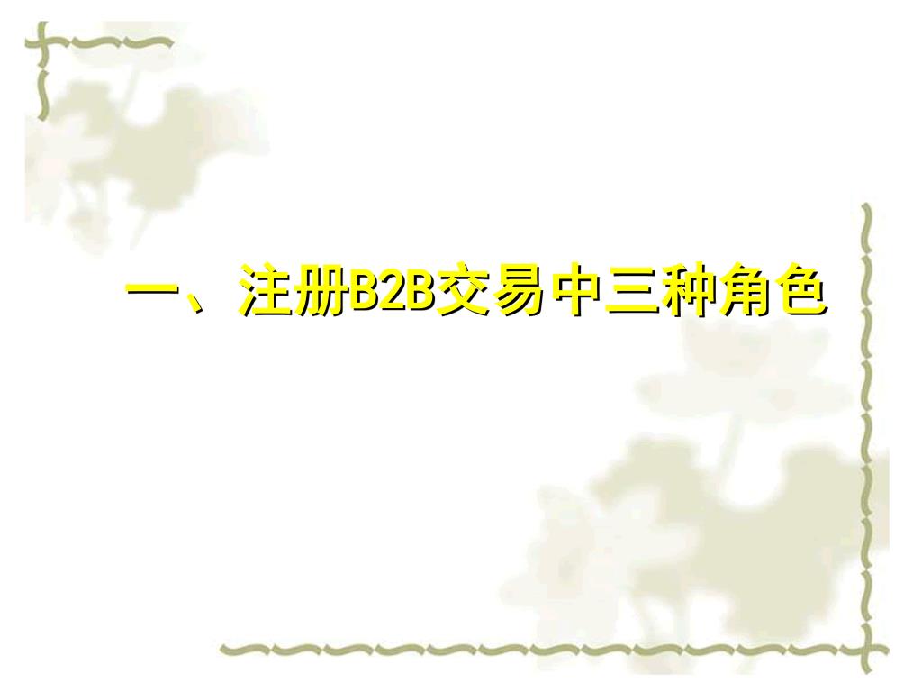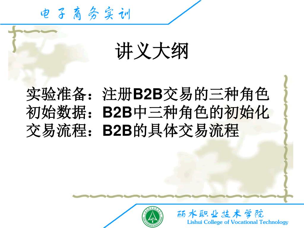 电子商务交易模式之“ B2B” —— 电子订单模式. 实验准备:注册 B2B 交易的三种角色 初始数据: B2B 中三种角色的初始化 交易流程: B2B 的具体交易流程. 讲义大纲. 一、注册 B2B 交易中三种角色. B2B 交易中的三种实验角色,即: 采购商 cgs *** 供应商 gys *** 物流商 wls ***. B2B 交易的三种角色. 注册前,先到 “ 电子银行 ” 模块 “ 企业网上银行 ” 申请各自企业的银行账号。