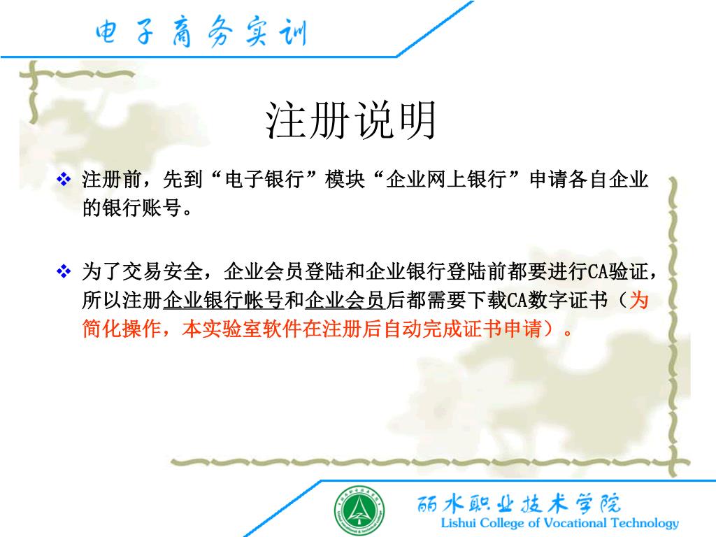 注册前,先到“电子银行”模块“企业网上银行”申请各自企业的银行账号。注册前,先到“电子银行”模块“企业网上银行”申请各自企业的银行账号。 为了交易安全,企业会员登陆和企业银行登陆前都要进行CA验证,所以注册企业银行帐号和企业会员后都需要下载CA数字证书(为简化操作,本实验室软件在注册后自动完成证书申请)。 注册说明