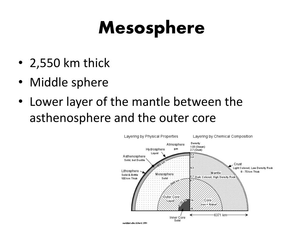 Mesosphere • 2,550 km thick • Middle sphere • Lower layer of the mantle between the asthenosphere and the outer core