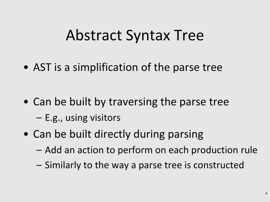 Abstract Syntax Tree • AST is a simplification of the parse tree • Can be built by traversing the parse tree • E.g., using visitors • Can be built directly during parsing • Add an action to perform on each production rule • Similarly to the way a parse tree is constructed